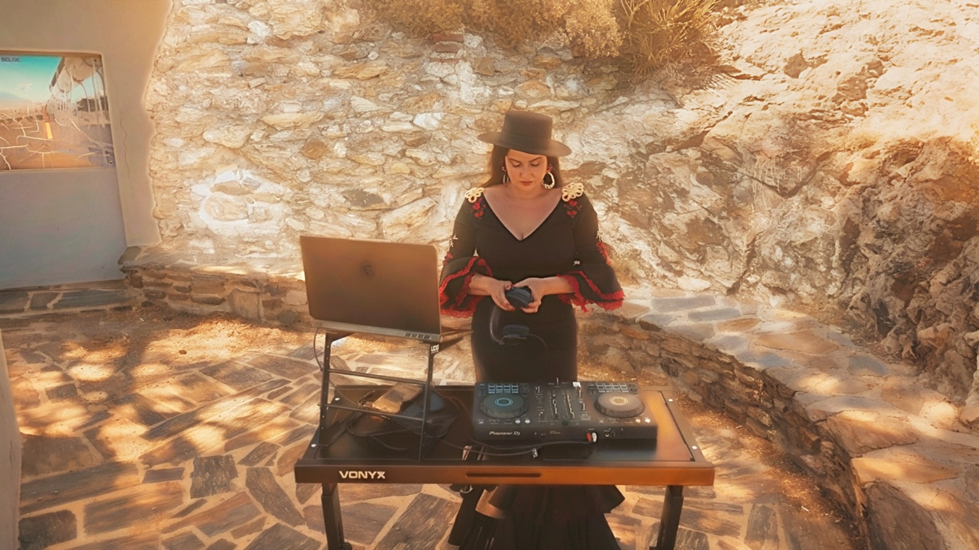 Son talent de danseuse gipsy flamenco est un atout à sa touche personnelle qui apporte à ses sets une dimension visuelle et artistique.